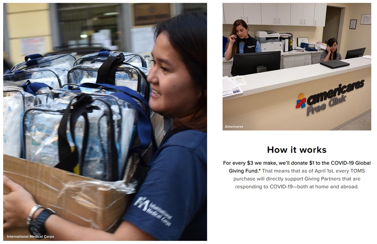 TOMS ofrece una de las campañas más singulares pero sencillas con su programa de caridad. Por cada par de zapatos comprados, la empresa donaría otro pagado a la caridad. La campaña se denominó «Uno por Uno» y permitió a los clientes realizar buenas acciones de la forma más conveniente posible.