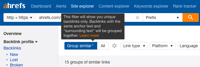 Es bastante difícil filtrarlos. Cuando utiliza Ahrefs ( revisión ) para el análisis de enlaces internos, eligen abordar esto agrupando los enlaces por el mismo ancla y texto circundante.