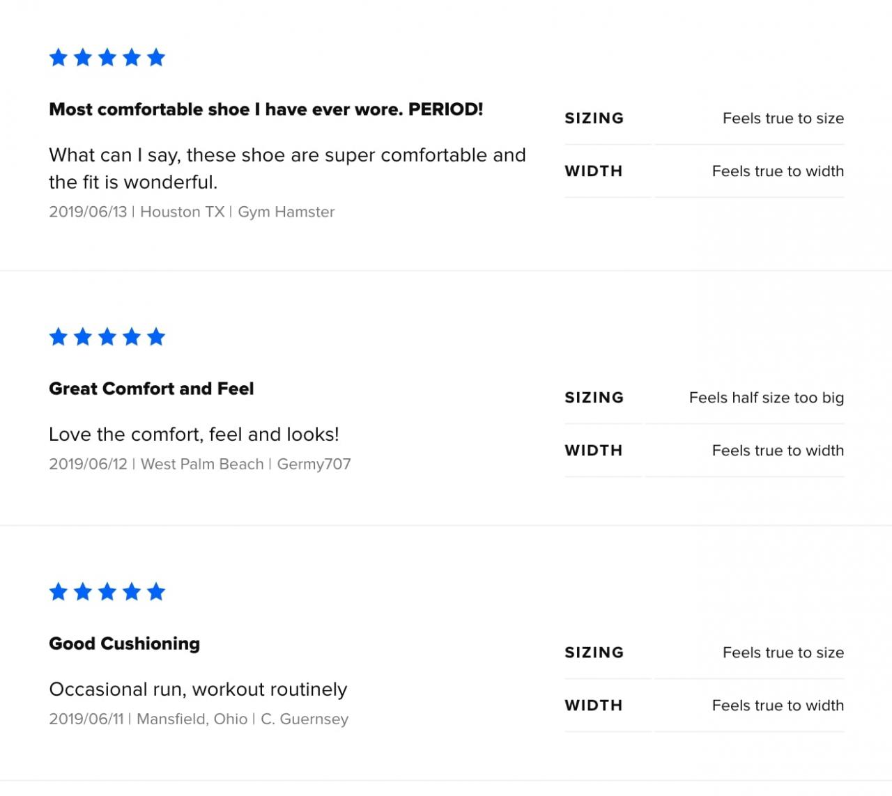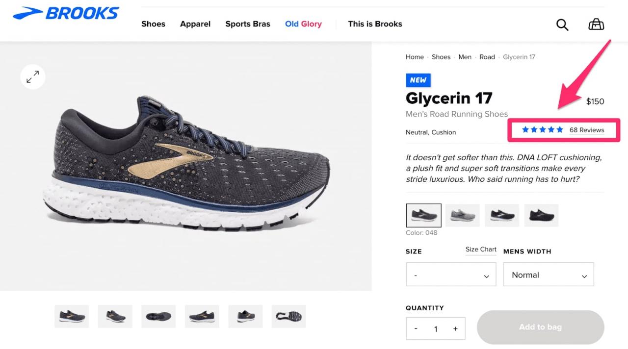 Sin embargo, el 49 % de los consumidores afirman que valoran la cantidad de reseñas en línea cuando evalúan una empresa. Otra cosa que vimos antes, Blenders Eyewear tenía comentarios en su página web. Solo asegúrese de que los comentarios no impidan que el consumidor compre. Aquí hay otro ejemplo de Brooks.