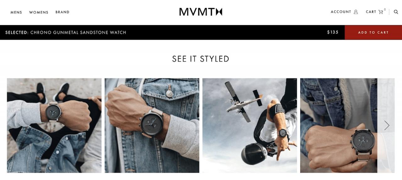 Supongamos que está vendiendo algo como un reloj de pulsera. La imagen de un reloj sola sobre una mesa en realidad no agrega mucho valor al cliente. Pero si lo coloca en la mano de alguien, le da una mejor idea de cómo se ve el producto si lo compra. Eche un vistazo a las fotos en la página web de MVMT.