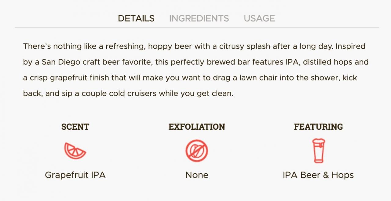 La fragancia de la cerveza inspiró esta particular barra de jabón. Fíjese bien en algún texto de este resumen. Usan «arrastrar una silla de jardín a la piscina» y «beber un par de cruceros fríos». Su producto no es para todos. Confían en usar la jerga para llegar a un público en particular. Normalmente, me mantendría alejado de esta frase. Sin embargo, en esta situación, es parte del plan general de marca.