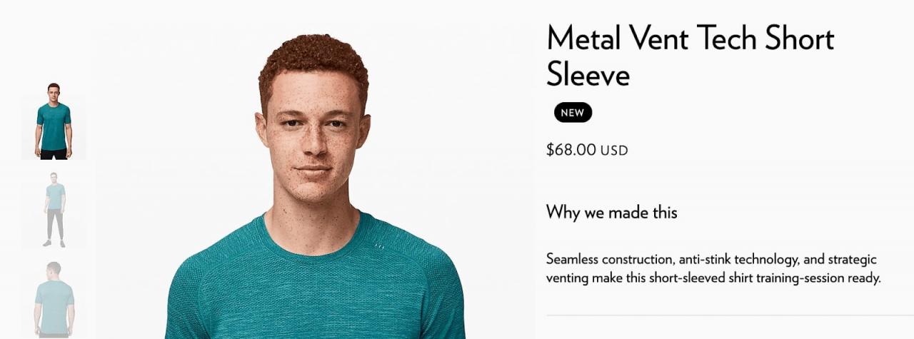 Tienen una explicación directamente debajo del artículo, «por qué hicimos esto». En resumen, describe que el producto no tiene costuras, está hecho con tecnología antiolor, es ventilado y para entrenamiento. No es solo una camiseta estándar para usar en la cama o en la casa. El alto precio de $68 por una camisa relativamente básica es justificable.