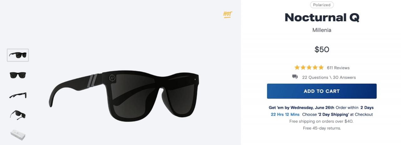 ¿Por qué alguien compra un producto de su sitio web? Necesitan hacer clic en el botón para pagar. Si el botón es difícil de encontrar en el sitio web, perderá conversiones. Mira la página web de Blenders Eyewear.