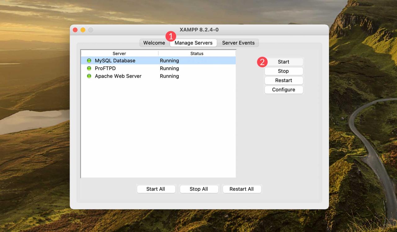 El siguiente paso es iniciar el servidor XAMPP. Comience con la apertura de XAMPP. Haga clic en la pestaña administrar servidores , luego haga clic en Iniciar para iniciar su servidor.