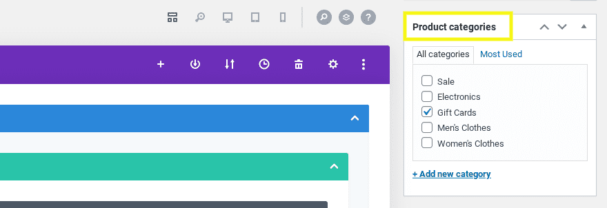 Una vez que haya terminado de configurar los ajustes de la tarjeta de regalo, lo único que queda por hacer es ponerlo en marcha. Puede elegir en qué páginas de productos aparece en la sección «Categorías de productos» de la página del producto de la tarjeta de regalo: