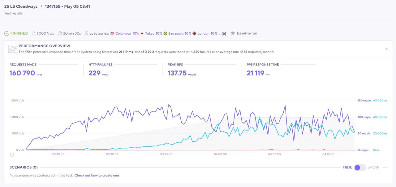 Como se mencionó anteriormente, estos resultados están sesgados debido a que se utiliza el plan de menor precio. Sin embargo, sigue siendo una buena indicación de lo que puede esperar con Cloudways, especialmente si elige su configuración de sótano de oferta. Durante la prueba de LoadStorm, Cloudways tuvo algunos problemas. Desafortunadamente, registró 229 fallas de HTTP a lo largo de la prueba, y las fallas aparecieron una vez que el servidor obtuvo más de 300 usuarios virtuales. Con las 160 790 solicitudes realizadas, el tiempo de respuesta promedio de P95 fue de 21 119 ms, que podría ser mejor.