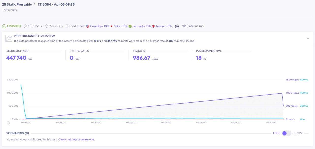 Pressable superó la prueba estática K6, que implicó solicitar repetidamente la página de inicio del sitio web durante 15 minutos. Manejó 447.740 solicitudes sin fallas de HTTP, con un RPS máximo de 986 y un tiempo de respuesta increíble de solo 19 ms. En general, Pressable se desempeñó de manera impresionante, mostrando su robustez y capacidad para manejar cualquier desafío.