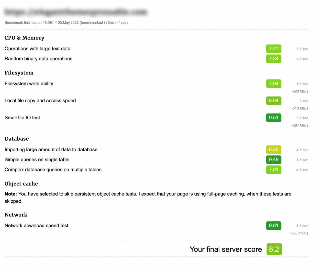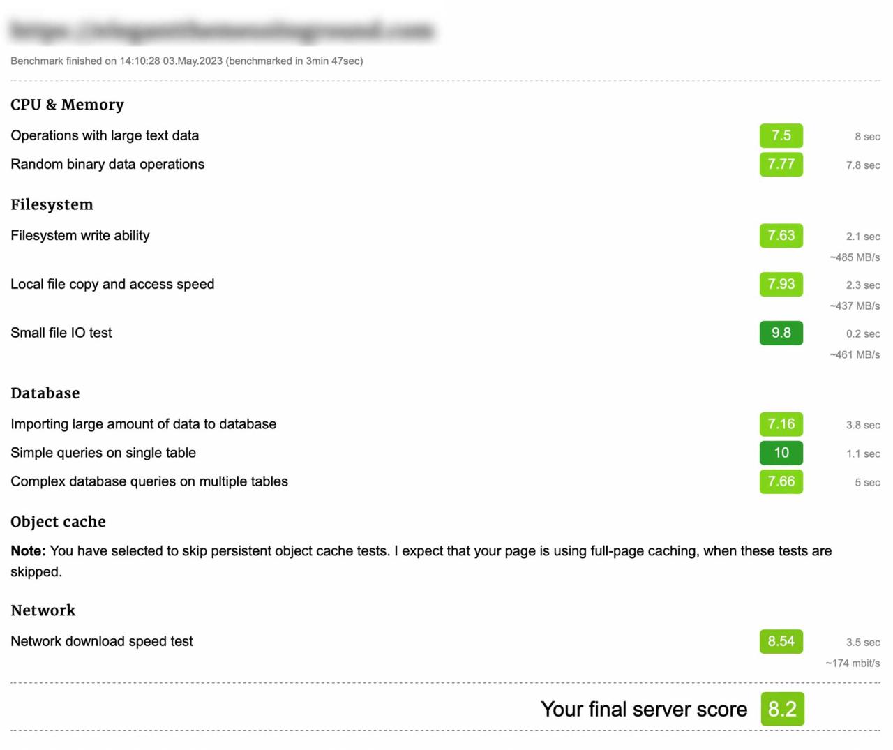 Para evaluar la velocidad de cada host, empleamos el complemento WordPress Hosting Benchmark . Esta herramienta, ejecutada desde dentro de PHP, nos permitió determinar el tiempo de procesamiento del servidor de cada host midiendo la velocidad de la CPU y la memoria, el tiempo de recuperación de datos del sistema de archivos y la base de datos, y probando la caché de objetos y la velocidad de la red. Sin embargo, optamos por no habilitar la métrica de almacenamiento en caché de objetos, ya que el autor del complemento experimentó resultados mixtos. Dicho esto, hablamos directamente con el desarrollador del complemento, quien nos aseguró que está al tanto de los problemas con el almacenamiento en caché de objetos y planea abordar estos problemas en las próximas actualizaciones.