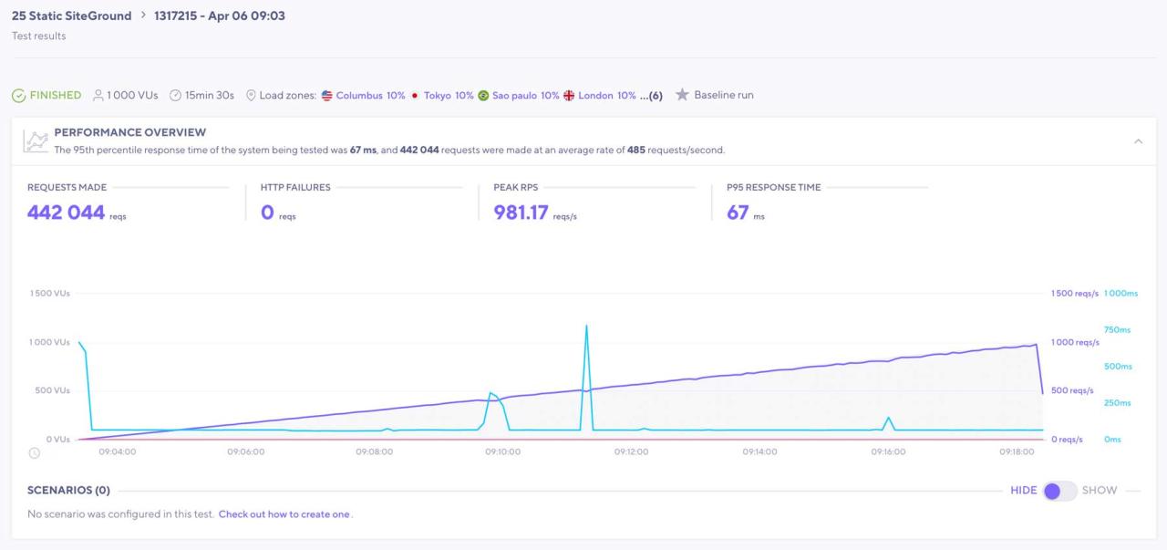 La prueba estática K6 impulsó aún más a SiteGround con 442.044 solicitudes. Sin embargo, aún entregó un fantástico tiempo de respuesta P95 de solo 67 ms y sin fallas de HTTP.