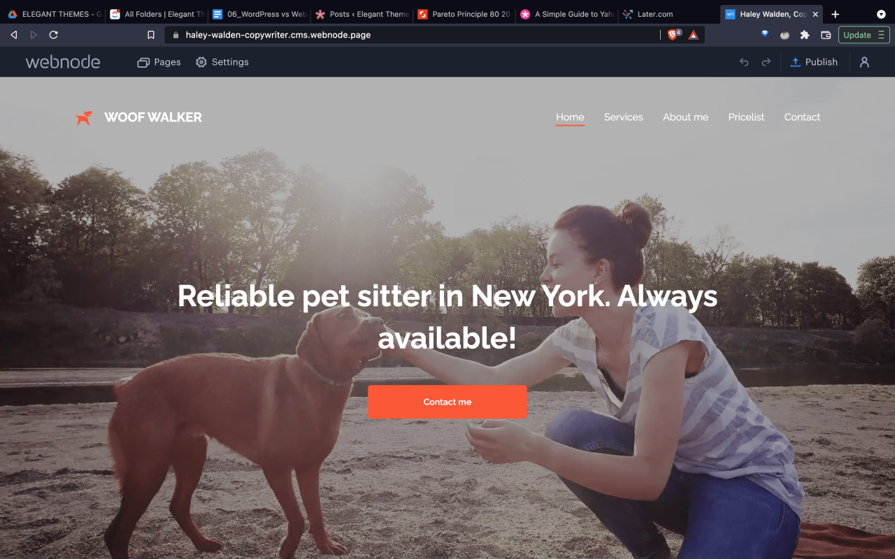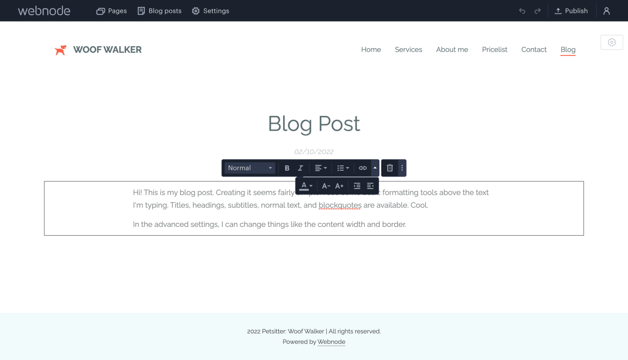 Las páginas de Webnode y las publicaciones de blog se pueden publicar desde el tablero. Si desea agregar una publicación de blog, Webnode le permite editarla directamente en la página. Escriba directamente en la plantilla para agregar su copia. Luego puede programar y publicar publicaciones de blog simples. Esto es diferente del editor de bloques de Gutenberg en que no ve los cambios en tiempo real. En WordPress, tienes que ajustar las páginas y publicaciones a través de vistas previas y ajustes, pero en Webnode, lo que ves es lo que obtienes (aunque no es un editor WYSIWYG como el editor clásico de WP).