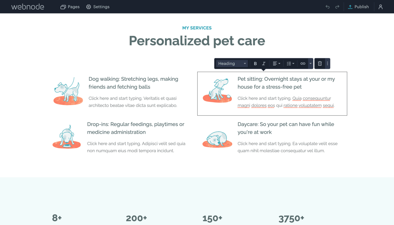 Webnode ofrece sitios web básicos y escaparates de comercio electrónico asequibles para pequeñas empresas. Ese es realmente su público objetivo en lugar de «todos» de WordPress. Los diseños se pueden personalizar hasta cierto punto dentro de la propia plataforma. Pero no son tan personalizables como los temas de WordPress . Aunque muy pocas plataformas ofrecen tanta flexibilidad.