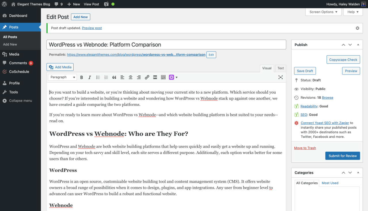 Cuando publica en WordPress, tiene la capacidad de programar una publicación con anticipación, asignar categorías y etiquetas, establecer una imagen destacada y optimizar para SEO. Los complementos como Yoast ayudan a los usuarios a ajustar el SEO y la legibilidad. Las características se pueden activar y desactivar dentro del propio editor.